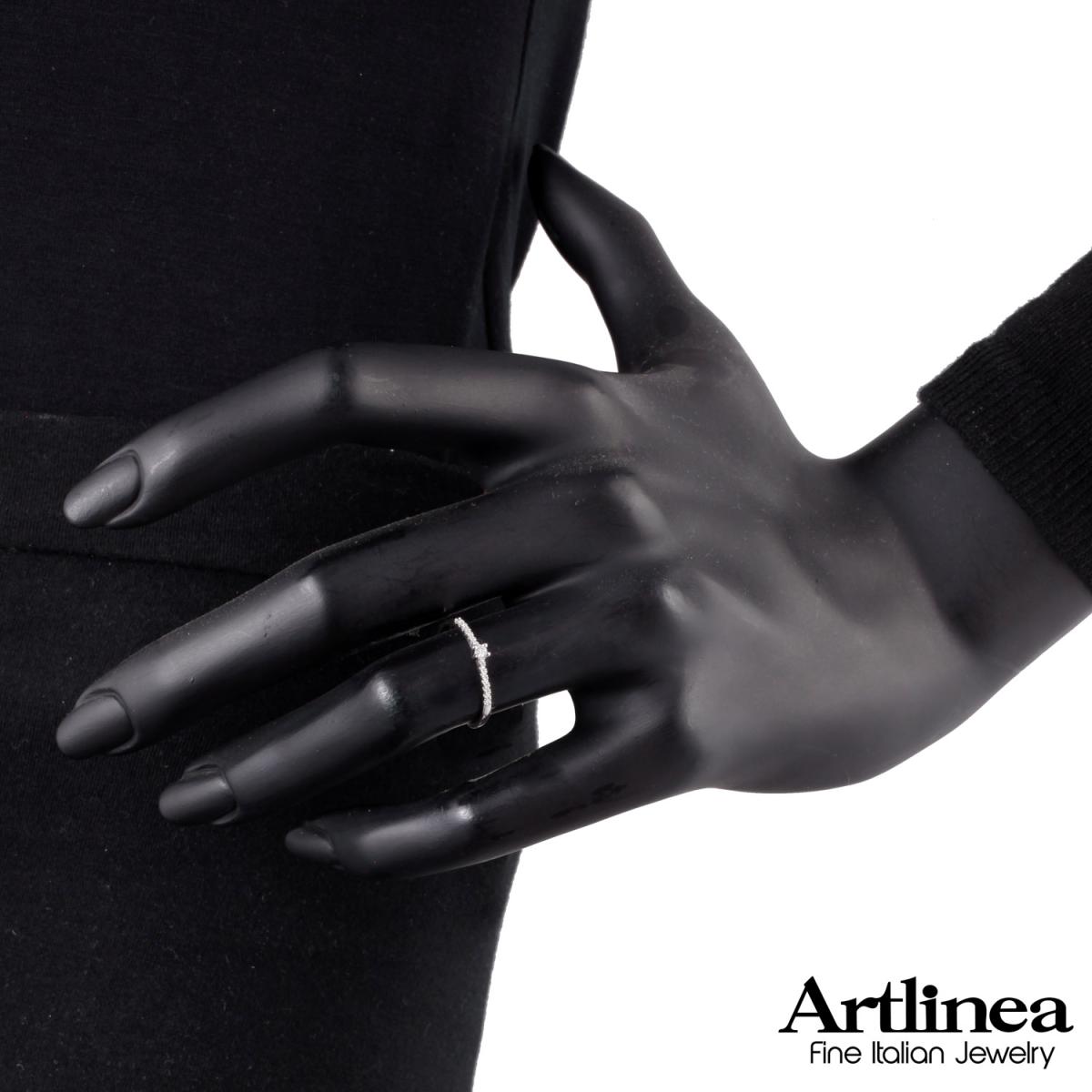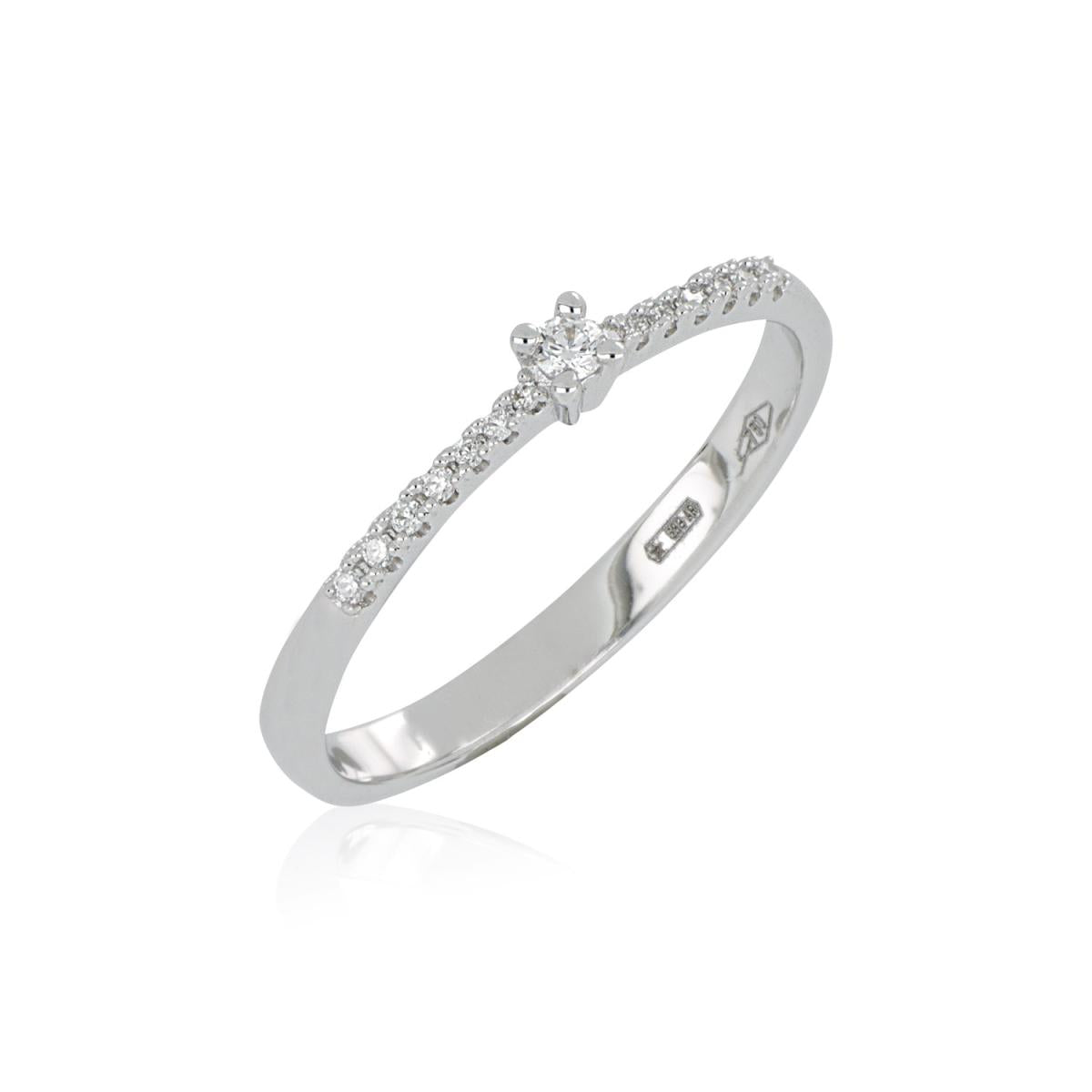 Anello solitario in oro bianco 18 carati con diamante centrale e riviere di diamanti incastonati nel gambo.