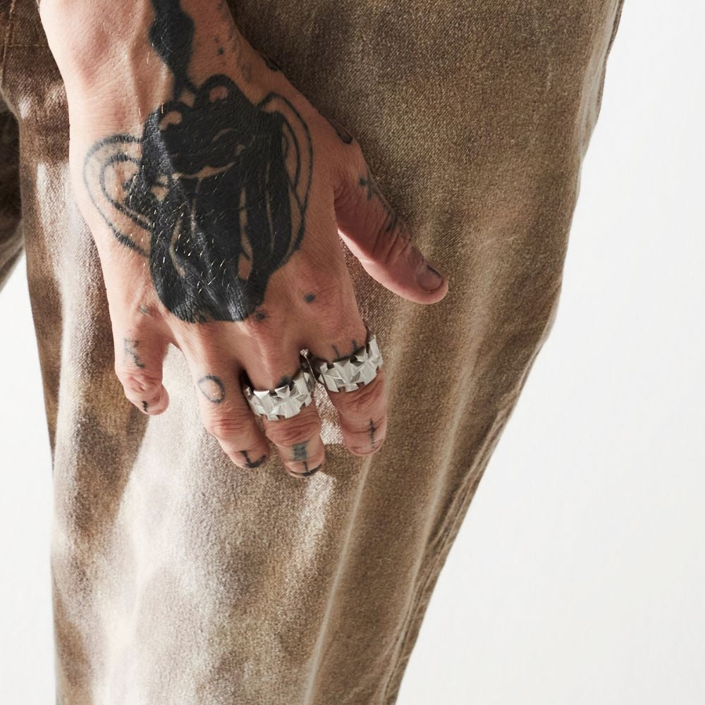 Da questa fusione tra moda e artigianalità, presentiamo la nostra prima capsule caratterizzata da temi trascendentali: croci bolded, spade, fulmini, stelle e numeri biblici, finemente lavorati con finiture satinate, immediatamente riconoscibili.