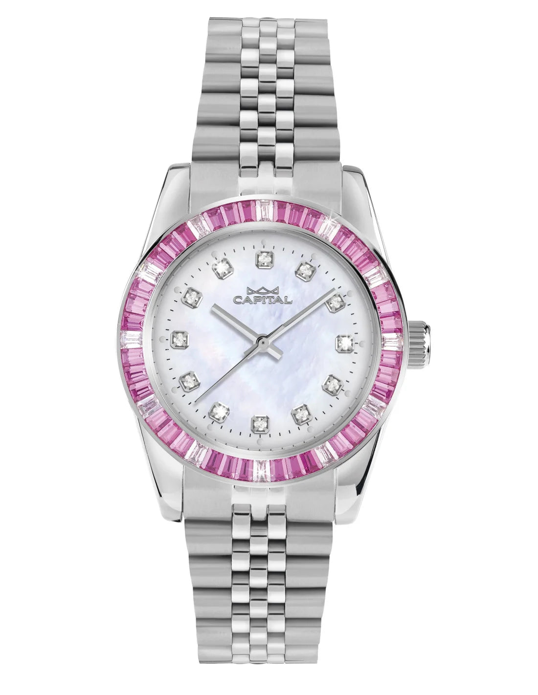 MATERIALE COLORE E FORMA CASSA | Cassa in acciaio rotonda con ghiera con pietre incastonate |