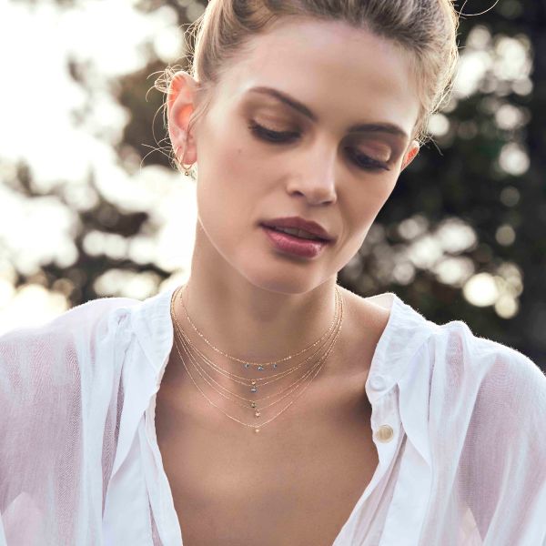 Il girocollo presenta un diamante nudo colorato blu pendente di 0,07 carati e due diamanti nudi colorati blu di 0,05 carati sospesi nel vuoto.